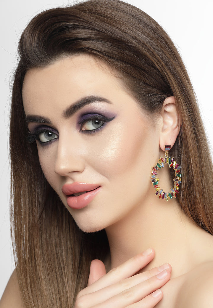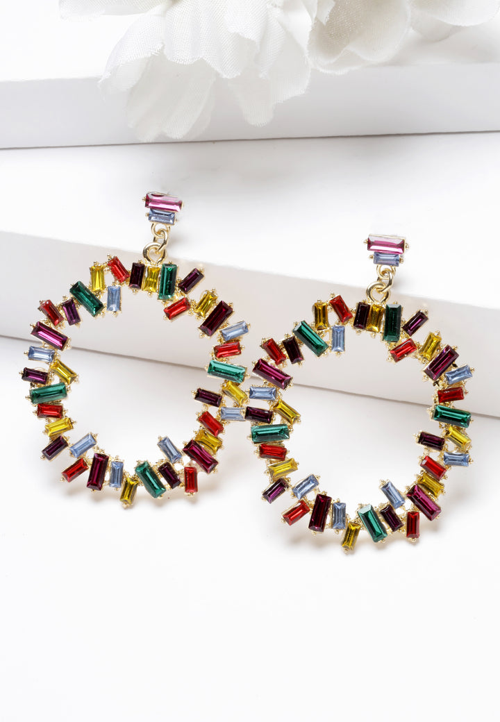 De flerfarvede runde cirklede krystaldråbeøreringe er et fantastisk og unikt tilbehør, der vil tilføje farve og gnistre til ethvert outfit. Disse øreringe er designet med sans for detaljer og har et moderne, legende design, der vil slå hoveder. Bær dem sammen med en simpel sort kjole eller outfit for at skabe en farve og gnistre. Bær dem med et farvestrålende outfit for at komplementere de mange farver i øreringene.