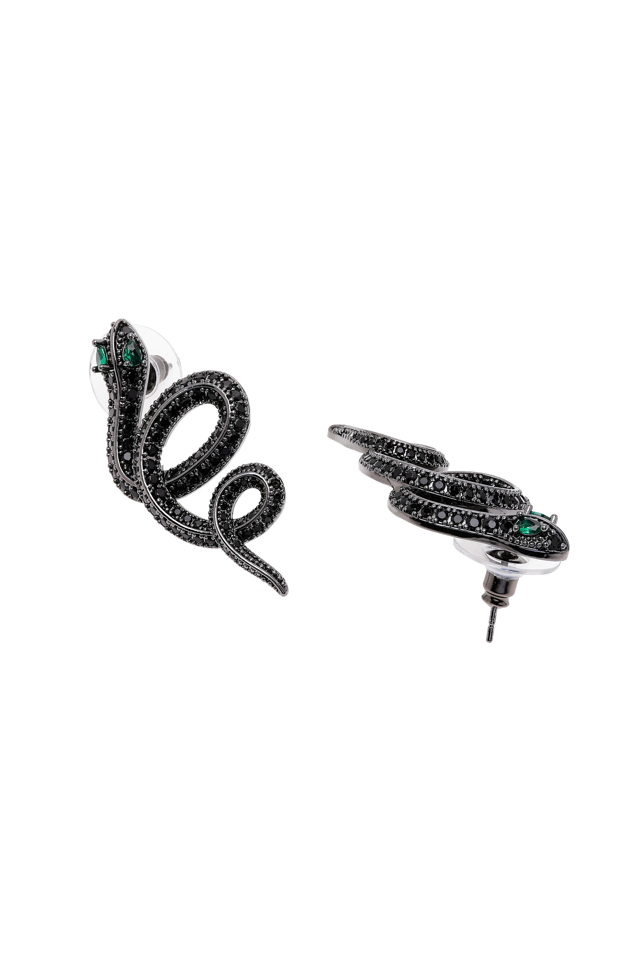 Omfavn dristig elegance med disse Black Serpent øreringe. Med et slående slange-design besat med sorte krystaller og fortryllende grønne ædelstensøjne, udstråler disse øreringe mystik og sofistikering. Perfekte til dem, der elsker kantede, men glamourøse accessories, tilføjer de et vildt og fængslende præg til ethvert outfit.