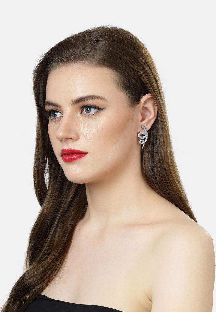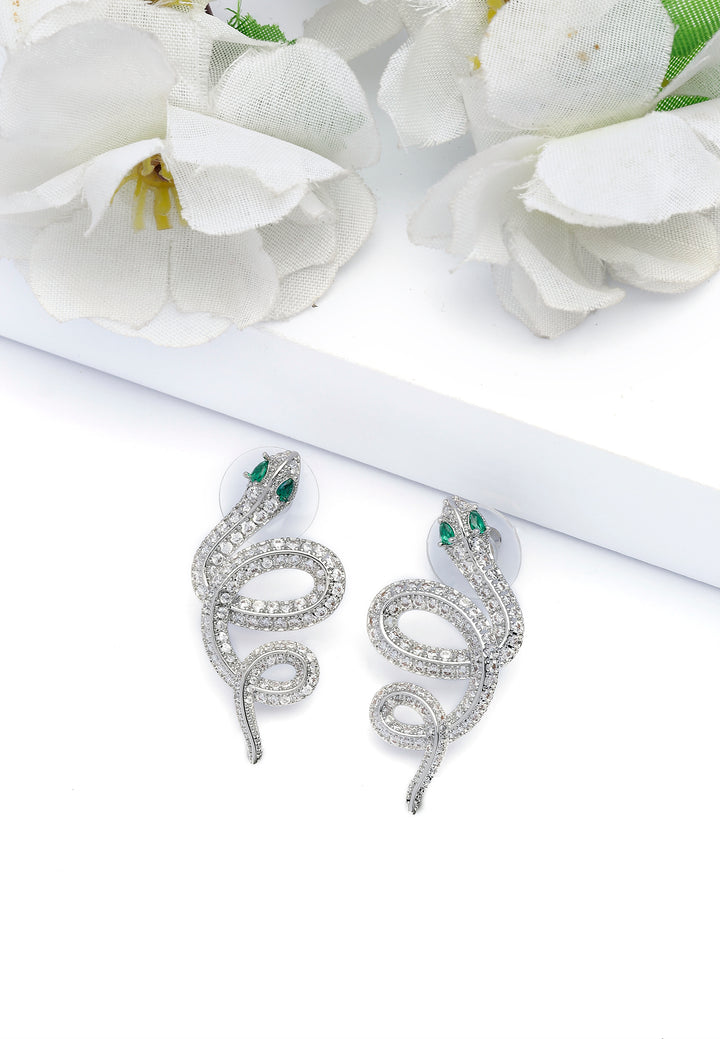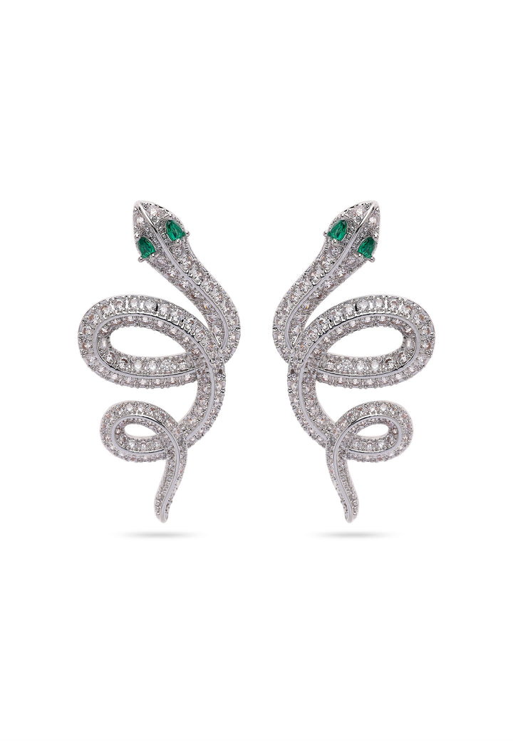 Entfesseln Sie Ihre innere Eleganz mit diesen funkelnden Schlangen-Silberohrringen. Gefertigt in einem faszinierenden Schlangendesign, sind diese Ohrringe mit schimmernden Kristallen besetzt und mit fesselnden grünen Edelsteinen akzentuiert. Eine perfekte Mischung aus Raffinesse und kühner Anziehungskraft, verleihen sie jedem Outfit einen Hauch von Mystik und Glamour.