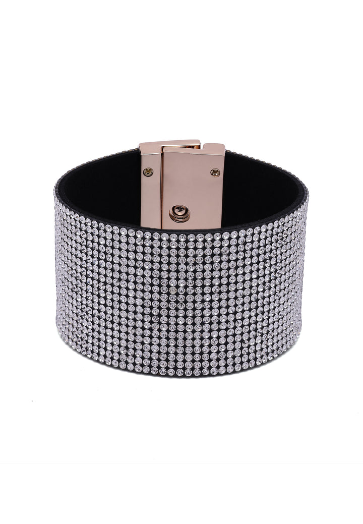 Wrap your wrist in pure diva energy. This wide leather cuff is drenched in clear crystals, creating a clear shimmer that feels straight off the red carpet. Lined with soft suede and finished with a sleek, high-polish clasp, it’s a bold, luxurious statement piece for nights when you want all eyes on you.