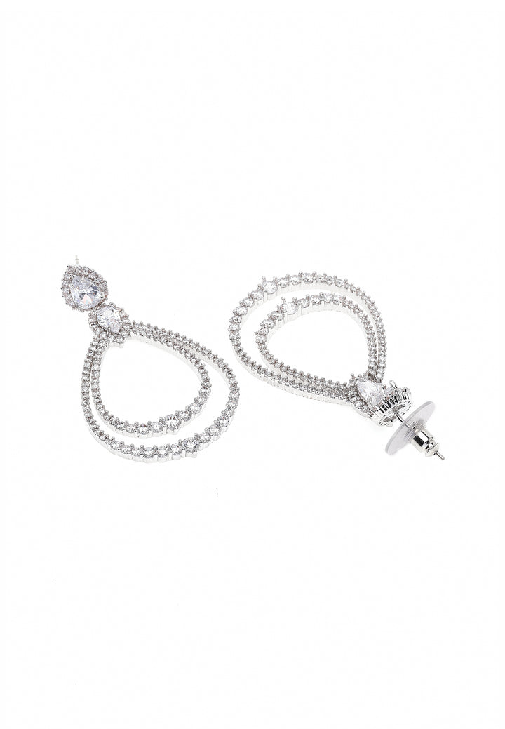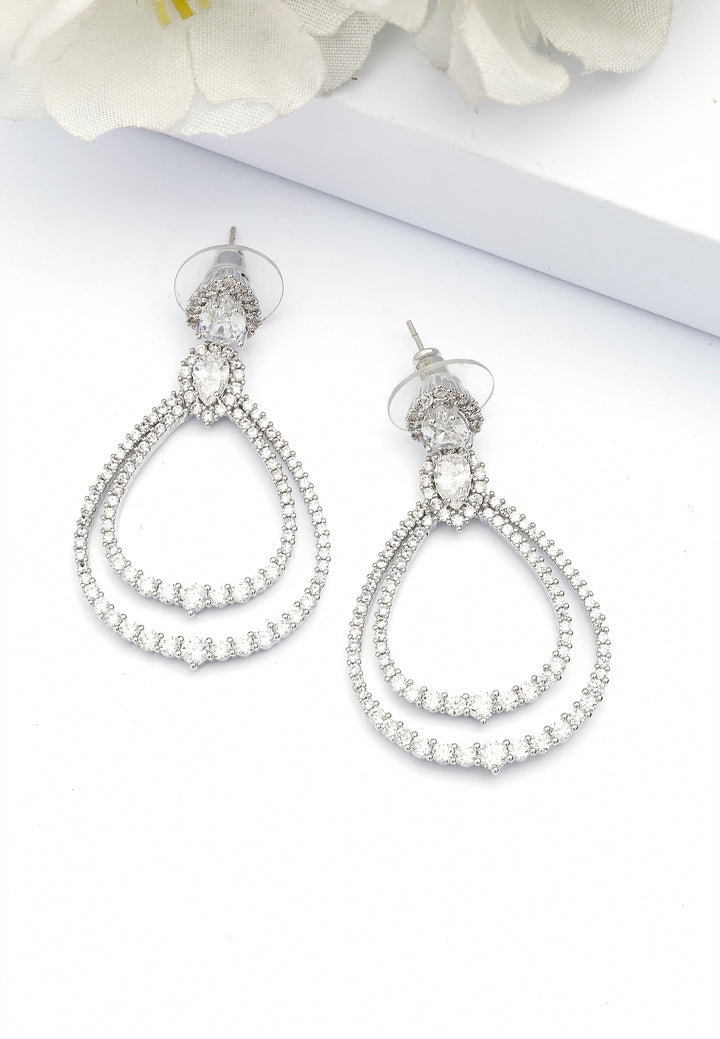 Tá na cluaiseanna leachtach airgid iontacha seo le dearadh fáinne dúbailte gile atá clúdaithe le clocha gleoite. Déanann a stíl shimplí agus shíoraí iad foirfe do ócáidí speisialta, ag cur lonradh galánta le haon éadaí.