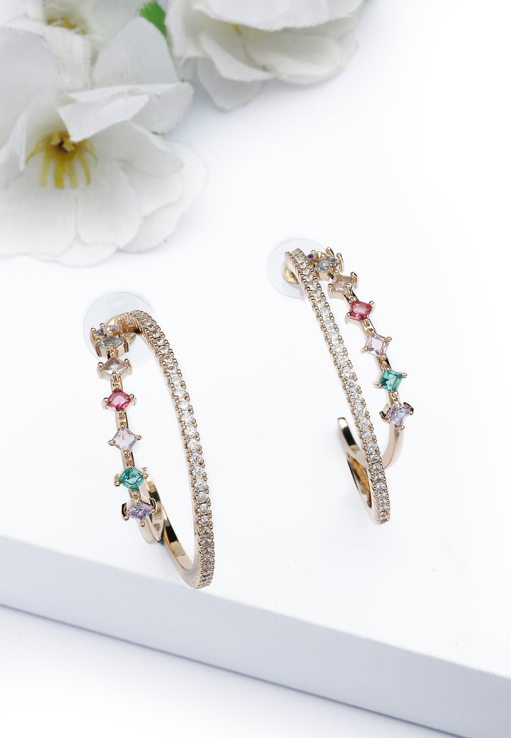 Migliora il tuo look con questi Orecchini a Cerchio Multi-Tono in Oro. Caratterizzati da una base dorata lussuosa incastonata con cristalli scintillanti, questi cerchi sono adornati con vivaci gemme pastello per un tocco chic e giocoso. Perfetti per aggiungere eleganza all'abbigliamento quotidiano o per completare un ensemble serale glamour, questi orecchini fondono sofisticatezza con un tocco di colore.