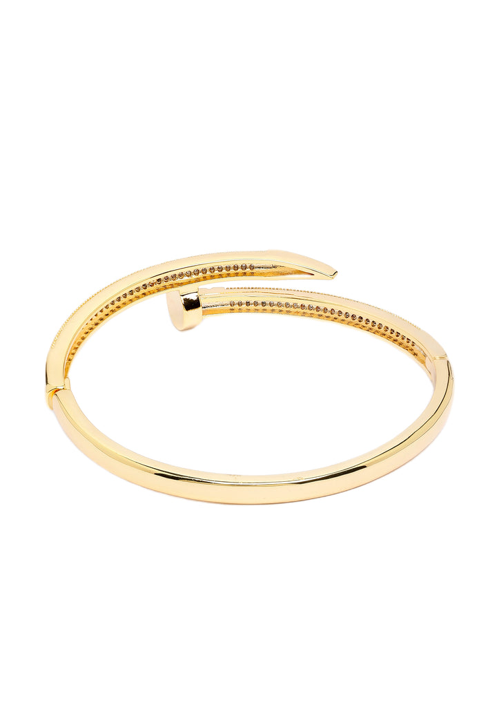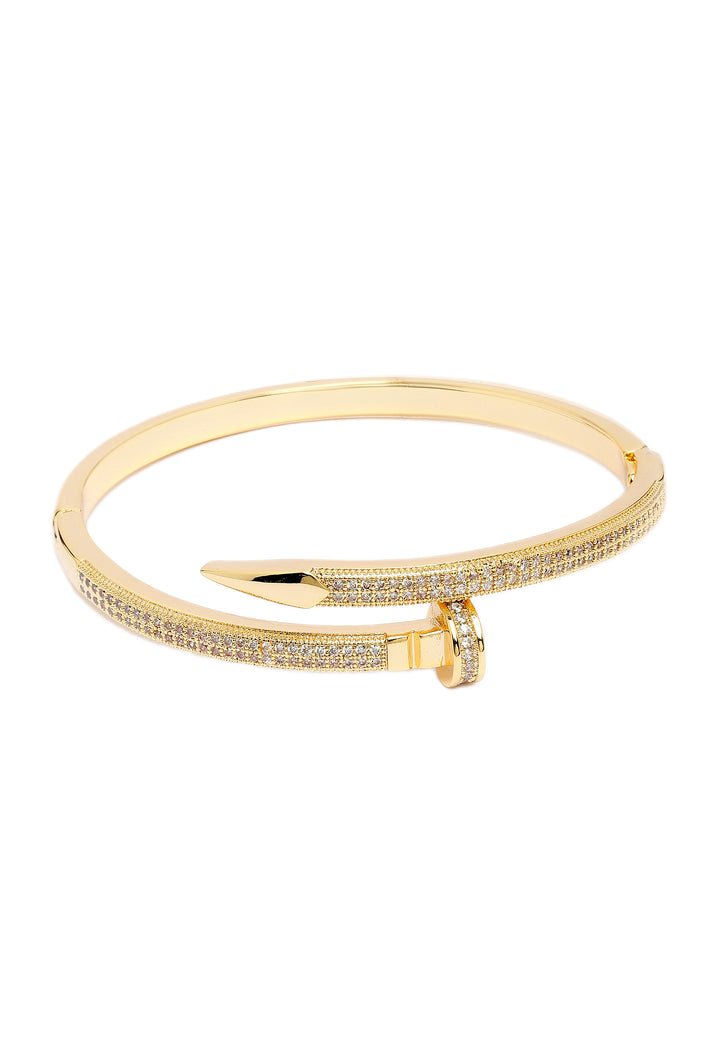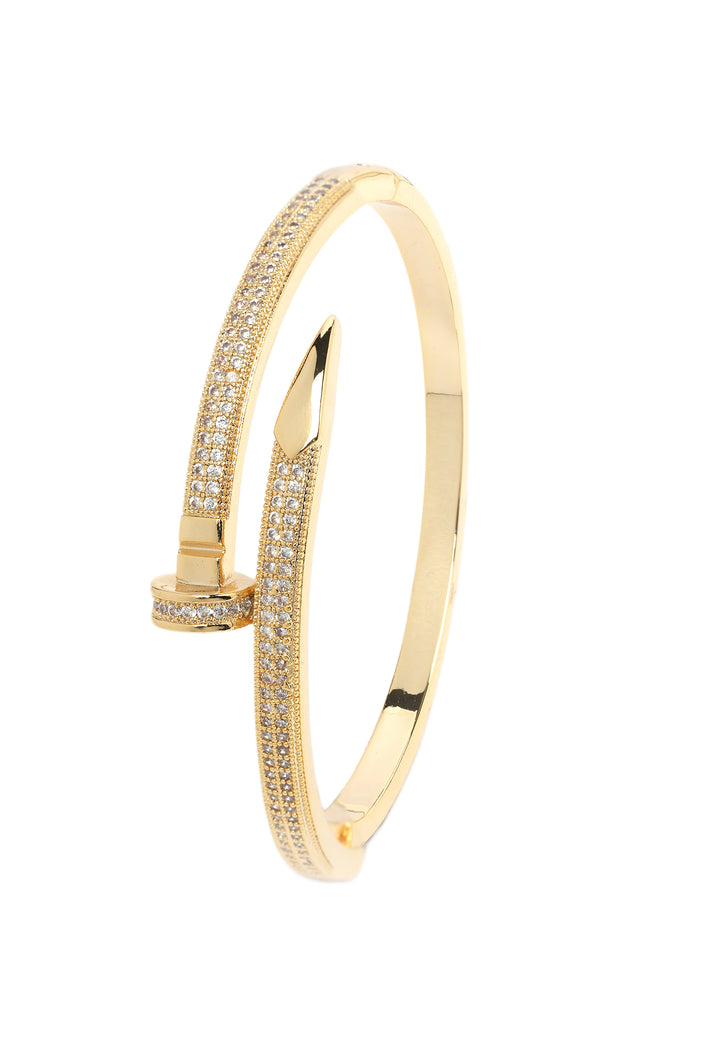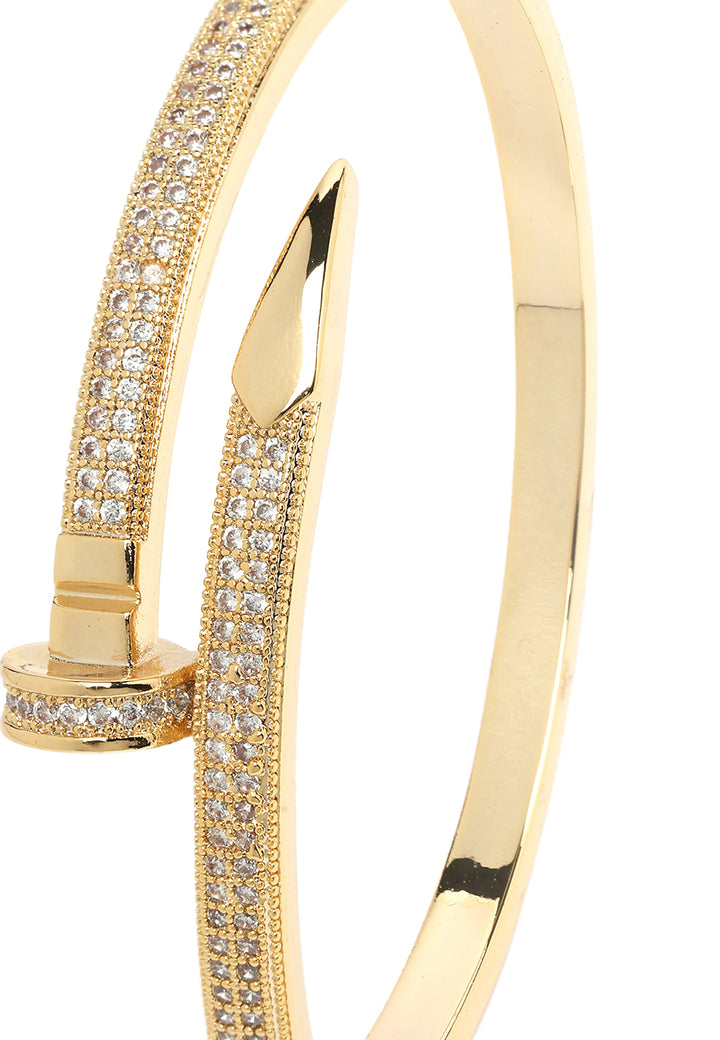 Kultainen rannekoru, jossa on monimutkainen tekstuuri ja yksi kimalteleva timantti, pidetään hellästi sormien välissä, esitellen sen hienostunutta käsityötä ja ajattomuutta.