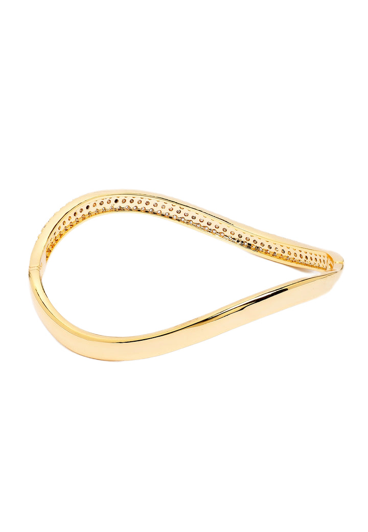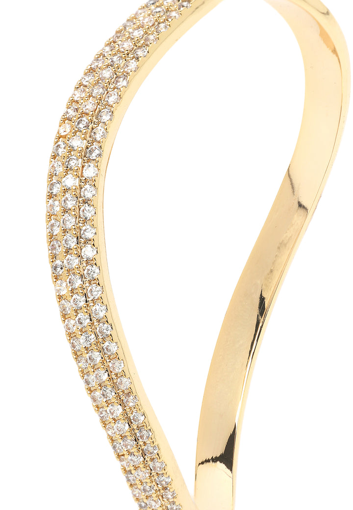 Bändin elegantti kaari, joka on koristeltu häikäisevällä kimaltelevien kivien valikoimalla, luo vangitsevan ja ainutlaatuisen ilmeen. Lämmin, kultainen sävy lisää ripauksen hienostuneisuutta, mikä tekee siitä täydellisen asusteena nostamaan minkä tahansa asun.