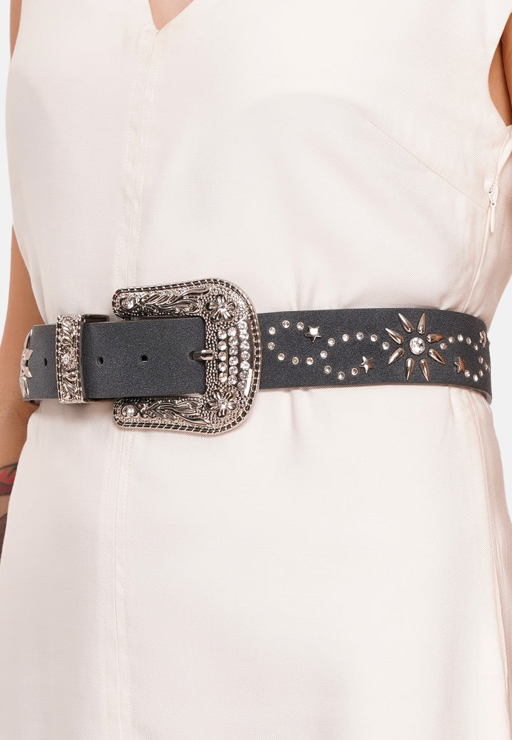 Musta suunnittelijan vyö kohokuvioidulla soljella
