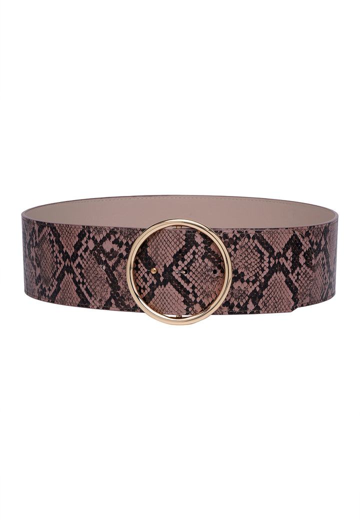 Vaaleanpunainen käärmeennahkakuosisella kaksipistokkeisella vyöllä on hienostunut ja silmiinpistävä asuste, joka yhdistää käärmeennahkakuosin eksoottisen viehätyksen beigejen sävyjen monipuolisuuteen. Hillitty mutta rohkea käärmeennahkakuosi lisää tekstuuria ja ulottuvuutta, kun taas kaksipistokkeet tarjoavat ainutlaatuisen, muotitietoisen kosketuksen. Neutraali beige väri tekee tästä vyöstä helpon yhdistää erilaisiin asuihin, tarjoten rohkeaa, nykyaikaista ilmettä ilman, että se ylittää asusi. Vyön kaksipistokkeet ja eksoottinen kuosi tuovat hauskaa kontrastia yksinkertaiseen asuun, tehden siitä täydellisen päivänviettoon, samalla kun se näyttää tyylikkäältä ja viimeistellyltä.