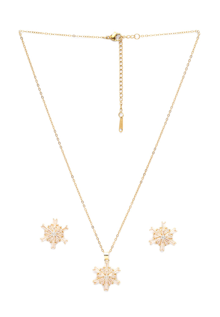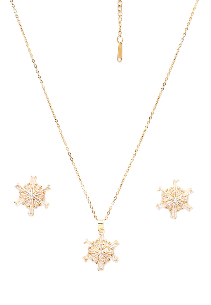 Vapauta sisäinen tähtesi tällä säihkeällä korusetillä, joka on suunniteltu saamaan sinut loistamaan kirkkaammin kuin koskaan! Kaulaketju ja siihen sopivat korvakorut esittelevät rohkeita tähtisateen muotoja, jotka on valmistettu monimutkaisilla kultaisilla yksityiskohdilla ja kimaltelevilla kivillä, jotka vangitsevat valon joka kulmalta. Täydellinen päät kääntämään ja huomion varastamiseen, tämä setti lisää ripauksen taivaallista glamouria mihin tahansa asuun. Olitpa menossa juhliin tai lisäämässä ripauksen asennetta jokapäiväiseen tyyliisi, tämä setti takaa, että olet huomion keskipisteenä.