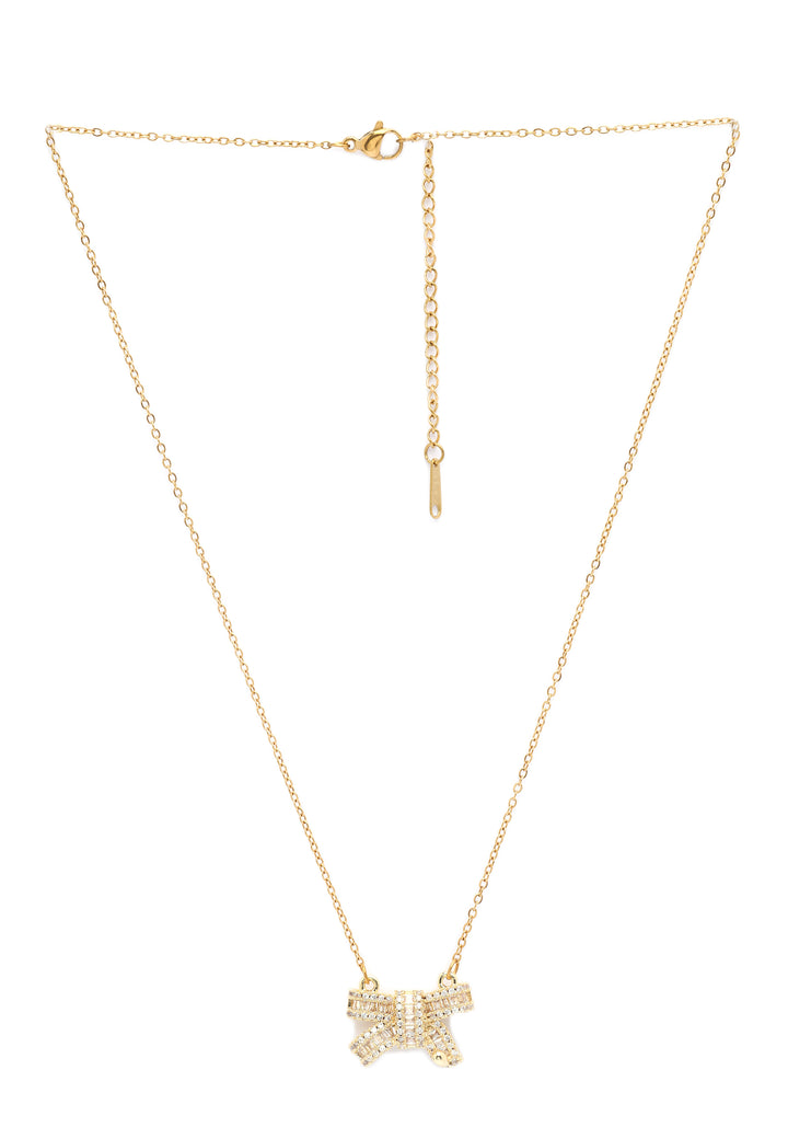 Lisää viehätystä ilmeeseesi tällä upealla rusetin muotoisella kaulaketjulla! Valmistettu säihkeästä kultapinnasta ja koristeltu kimaltelevilla kivillä, rusetti symboloi eleganssia ja tyyliä. Monimutkainen yksityiskohtaisuus ja ajaton muotoilu tekevät siitä täydellisen arkipukeutumisen kohottamiseen tai juhlavaatteiden täydentämiseen. Tämä kaulaketju on ihastuttava tapa ilmaista eleganssia ja naisellisuutta, mikä tekee siitä välttämättömän lisäyksen korukokoelmaasi.